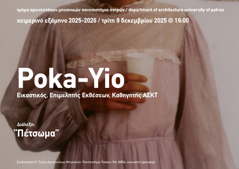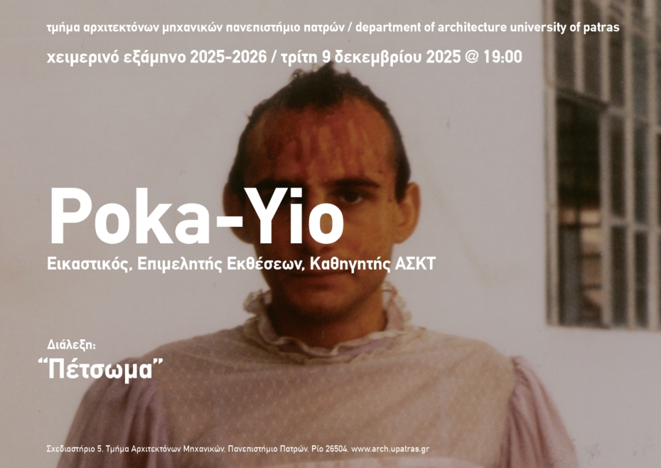 Μια παρουσίαση του έργου και της σκέψης του Poka-Yio Πέτσωμα (το): Το σανίδωμα της στέγης όπου πατάνε τα κεραμίδια, η επικάλυψη με πετσί-δέρμα και ως ιδιωματικός ναυτικός όρος, το περίβλημα του σκάφους. Πως ξεκινάς την πορεία ως δημιουργός σε μια εποχή επισφάλειας σαν τη σημερινή; Μέσα από την παρουσίαση του έργου του ο Poka-Yio φέρνει παραδείγματα για εναλλακτικά εφόδια που καλείται να αποκτήσει ο νέος δημιουργός. Από το στούντιο του ως την Μπιενάλε της Αθήνας και το LAB12 στην ΑΣΚΤ, ο Poka-Yio διερευνά τους όρους σύνδεσης πολιτικού και προσωπικού, καθώς και την ταλάντωση μεταξύ έλξης και απώθησης κατά τη δύση του Πολιτισμού της Επιθυμίας.