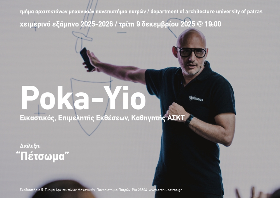 Μια παρουσίαση του έργου και της σκέψης του Poka-Yio Πέτσωμα (το): Το σανίδωμα της στέγης όπου πατάνε τα κεραμίδια, η επικάλυψη με πετσί-δέρμα και ως ιδιωματικός ναυτικός όρος, το περίβλημα του σκάφους. Πως ξεκινάς την πορεία ως δημιουργός σε μια εποχή επισφάλειας σαν τη σημερινή; Μέσα από την παρουσίαση του έργου του ο Poka-Yio φέρνει παραδείγματα για εναλλακτικά εφόδια που καλείται να αποκτήσει ο νέος δημιουργός. Από το στούντιο του ως την Μπιενάλε της Αθήνας και το LAB12 στην ΑΣΚΤ, ο Poka-Yio διερευνά τους όρους σύνδεσης πολιτικού και προσωπικού, καθώς και την ταλάντωση μεταξύ έλξης και απώθησης κατά τη δύση του Πολιτισμού της Επιθυμίας.