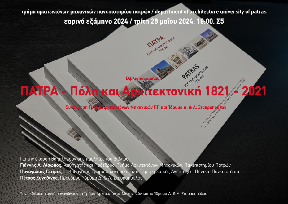Η βιβλιοπαρουσίαση θα γίνει την Τρίτη 28 Μαΐου 2024, 19:00, στο Σχεδιαστήριο 5, Τμήμα Αρχιτεκτόνων Μηχανικών, Πανεπιστήμιο Πατρών,