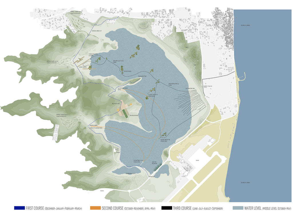 Στις αλυκές της Λάρνακας ο χρόνος διαιρείται σε 3 περιόδους (Δεκέβριος – Μάρτιος, Απρίλιος – Μάιος, Οκτώβριος – Νοέμβριος). Η πρώτη περίοδος χαρακτηρίζεται από την ύπαρξη μεγάλης ποσότητας νερού και αποδημητικών πτηνών, η δεύτερη απο την ύπαρουσία νερού και η τρίτη απο την παρουσία νερού για μικρό χρονικό διάστημα και την εμφάνιση άλατος. Η πρόταση αποτελεί έναν συνδυασμό τριών εποχιακών διαδρομών που λαμβάνουν υπ’όψιν τα χαρακτηριστικά της κάθε περιόδου και οδηγούν τον επισκέπτη σε σημαντικά σημεία για την κάθε περίοδο. Στόχος της πρότασης είναι διατηρώντας τα χαρακτηριστικά των τριών περιόδων ο άνθρωπος να ενταχθεί αρμονικά στο βιότοπο. Η 1η διαδρομή εστιάζεται στην πτηνοπαρατήρηση αφού η πρώτη χρονική περίοδος (Δεκέμβριος – Μάρτιος) χαρακτηρίζεται από την μεγάλη συγκέντρωση πτηνών. Η 2η εποχιακή διαδρομή είναι ενεργή από τον Οκτώβριο έως το Νοέμβριο και από τον Απρίλιο μέχρι τον Μάιο. Η συγκεκριμένη διαδρομή μπορεί να γίνει με πλωτά μέσα αφού η απουσία των πτηνών κατά την διάρκεια των συγκεκριμένων μηνών επιτρέπει την είσοδο του ανθρώπου στο νερό. Η 3η εποχιακή διαδρομή αποκαλύπτεται κατά την εξάτμιση του νερού. Είναι ενεργή από τον Ιούνιο μέχρι το Σεπτέμβριο και αποτελεί προέκταση της πρώτης διαδρομής. Το μονοπάτι σχηματίζεται εντός της υδατικής λεκάνης και αποκαλύπτεται κατά τη διάρκεια της θερινής περιόδου, την εποχή της συγκομιδής αλατιού. Έτσι, αυτή είναι η οδός που οδηγεί στις αλυκές, όπου οι άνθρωποι μπορούν να παρακολουθήσουν την αναβίωση της συγκομιδής αλατιού.