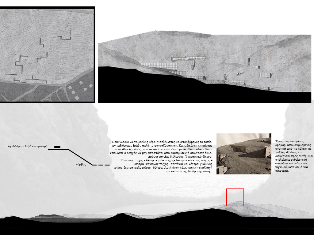 Εισερχόμενοι στο Ελληνικό τοπίο, στον Σαρωνικό κόλπο, οι βυθίσεις και οι εξάρσεις του ανάγλυφου της φυσικής επιφάνειας καθώς και η ύπαρξη της θάλασσας, ως εμπόδιο αλλά και ως συνέχεια της κίνησης, δημιουργούν χώρους ή σημεία εκκίνησης, που γίνονται το έναυσμα για τη μετάλλαξη του ανάγλυφου, έτσι ώστε να συντεθεί μια σειρά τοπιακών επεμβάσεων σε ένα αδρανές παραθαλάσσιο τοπίο.